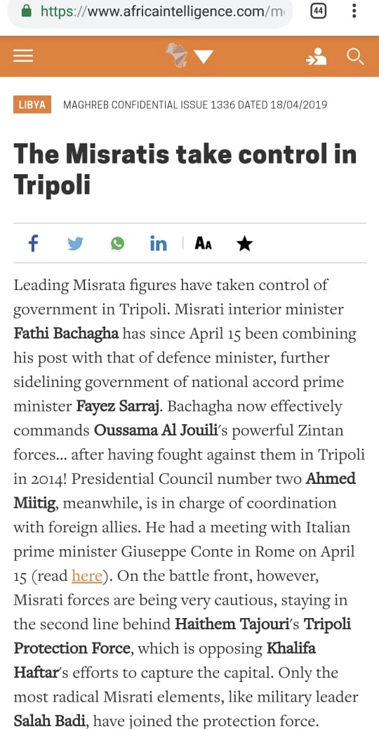 وقال التقرير أن شخصيات بارزة من مصراتة سيطرت فعلياً على الحكومة في طرابلس وذلك في أول تعليق من هذا الموقع المقرب من عدة دوائر مخابراتية في منطقة المتوسط ومن قطر أيضاً على التقارير التي تتحدث عن إنحسار سلطات السراج وإتساع نفوذ شخصيات منحدرة من مصراتة مقابل ما تقدمه له من دعم عسكري .
