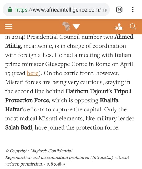 وختم ” أفريكا إنتلجنس ” تقريره مؤكداً بأن عناصر مصراتة  الأكثر تطرفاً مثل المعاقب دولياً صلاح بادي وبقية كتائب لوائه وحلفائه قد انضموا إلى قوة الحماية في بقت بقية القوات في الصف الخلفي .